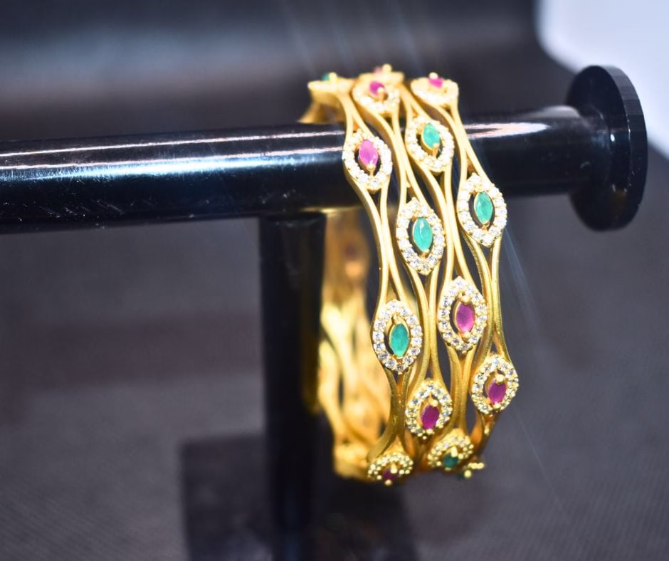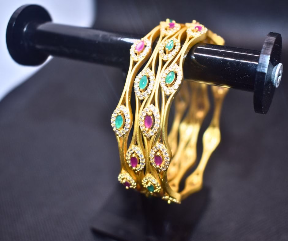 The design features a stunning gold-toned finish with a smooth, glossy texture that enhances its luxurious appeal. Each bangle is embellished with emerald green and ruby pink stones, perfectly complemented by shimmering zircon crystals. The unique wavy frame design brings an elegant touch and creates a graceful flow, ensuring the bangles sparkle beautifully under every light. Whether worn as a complete set or individually, these bangles make a statement of elegance.