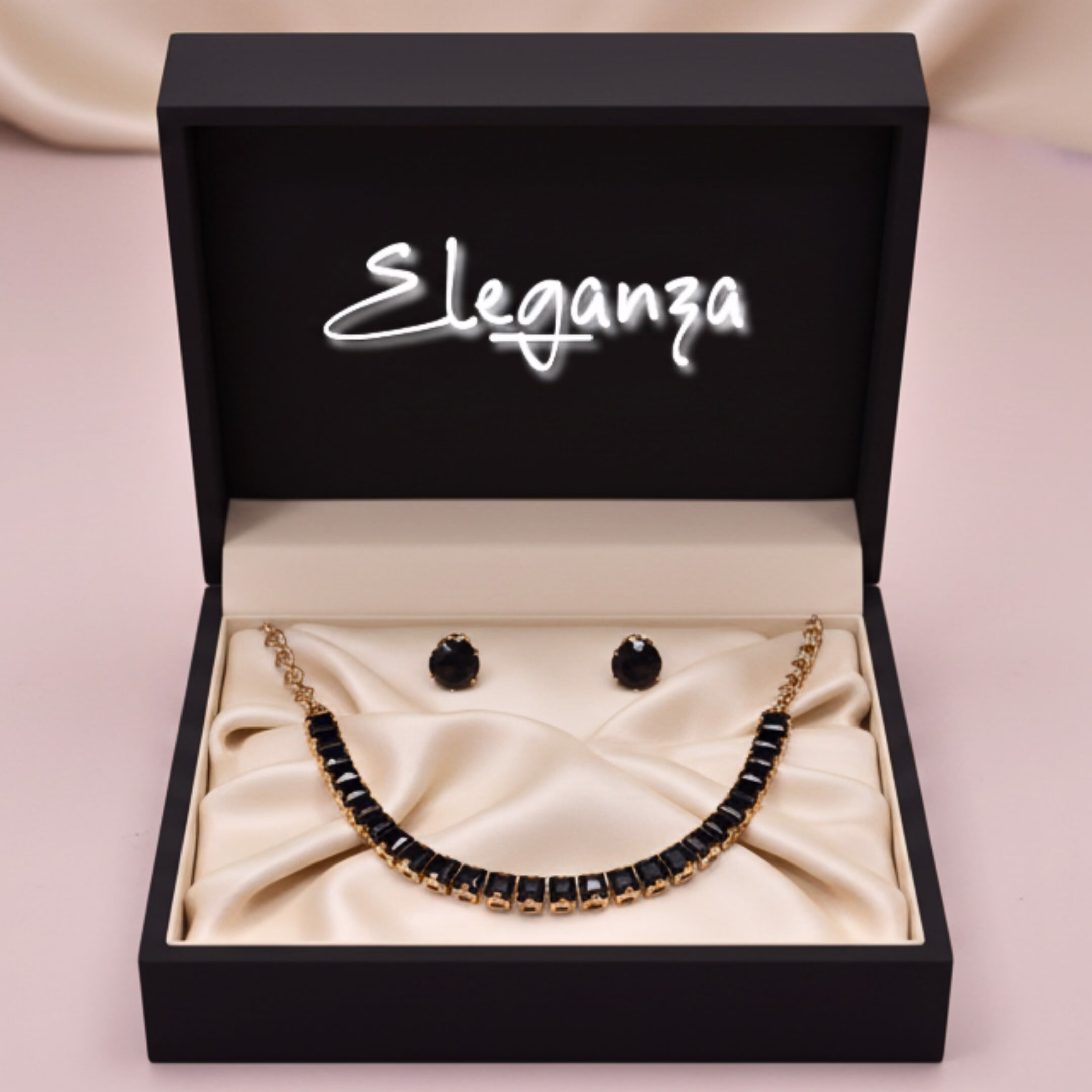 This beautiful necklace set is designed with a neat and stylish row of black zircon stones, placed closely in a single line pattern on a golden chain.