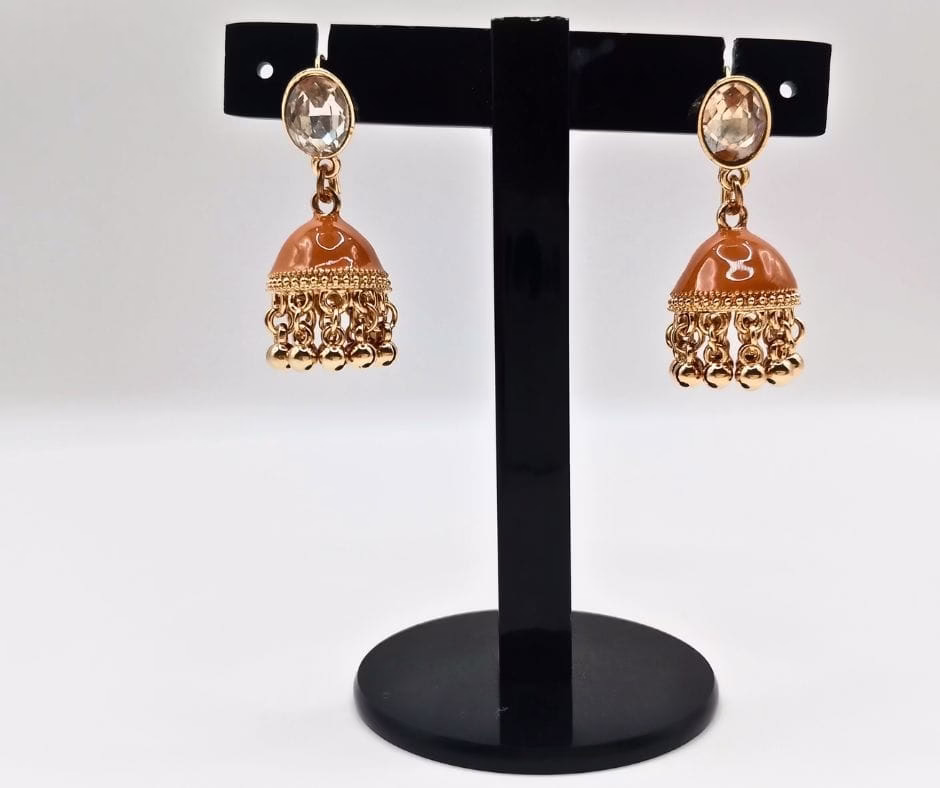 These short Jhumkas are designed with a Light Brown stone on top and a Caramel Color lower dome set on a golden base. Lightweight and trendy, they add a touch of elegance without being heavy or too fancy. Perfect for women who love stylish yet casual jewelry that easily suits both daytime/evening gatherings and festive occasions.