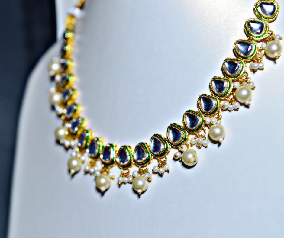 Discover timeless charm with the Eleganza KN-001, a beautifully designed Kundan necklace set that blends classic details with modern elegance. The necklace showcases a neat arrangement of teardrop-shaped Kundan stones, set in a smooth gold-tone base with a soft green enamel outline. Hanging below are white pearls in various sizes, adding gentle movement and a touch of grace. The rich blend of gold, green, and white makes it perfect for those who want a stylish yet graceful look.The matching earrings follow the same elegant design as the necklace, featuring teardrop Kundan stones, green detailing, and pearl drops for a perfectly balanced set..
