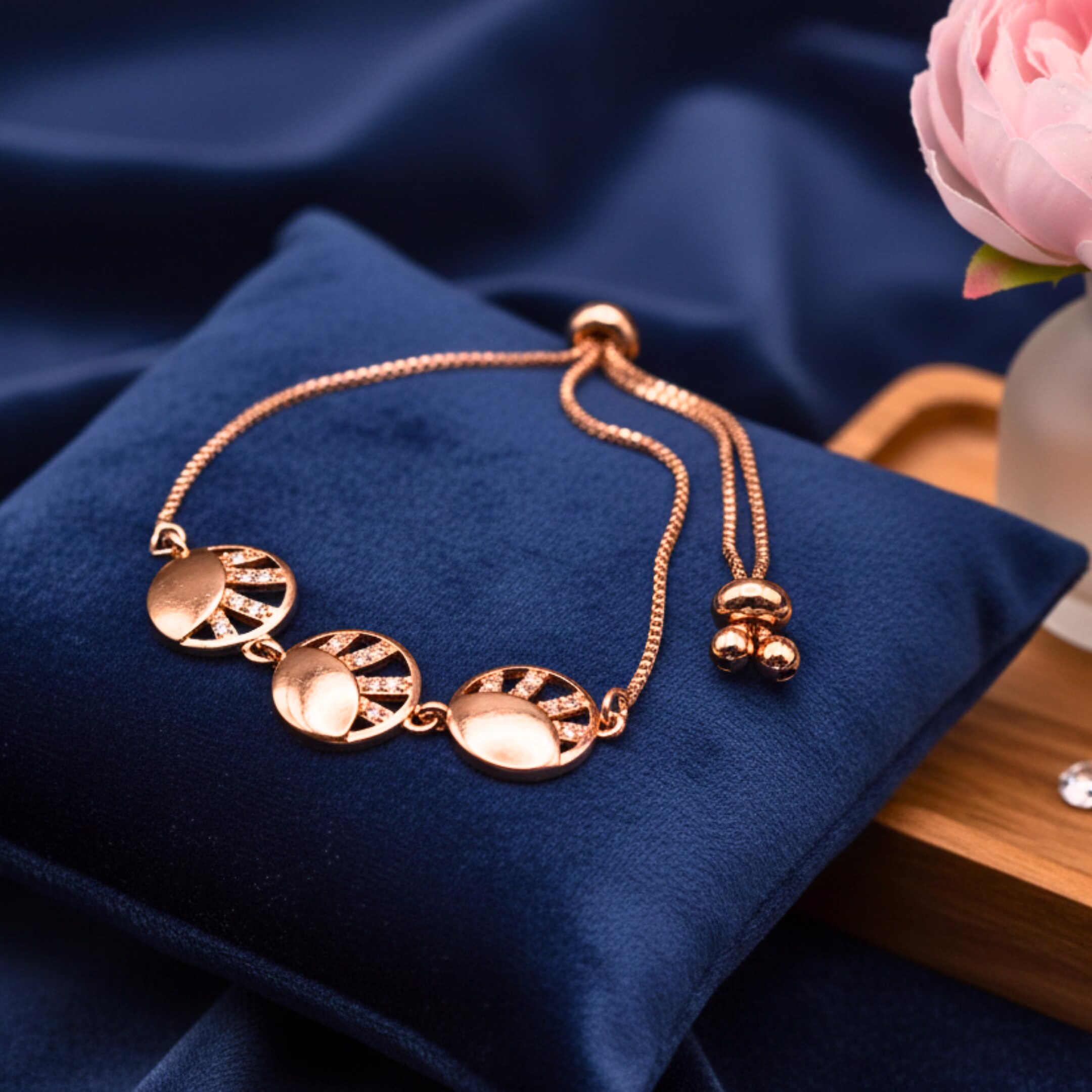 This beautiful golden bracelet has three round designs in the center. One side of each round is smooth golden, and the other side has tiny shiny stones placed in straight lines, giving it a neat, classy, and stylish look. It is lightweight, comfortable, and adjustable, so it fits every wrist easily. The overall look is fancy yet simple, making it ideal for both daily use and special occasions.