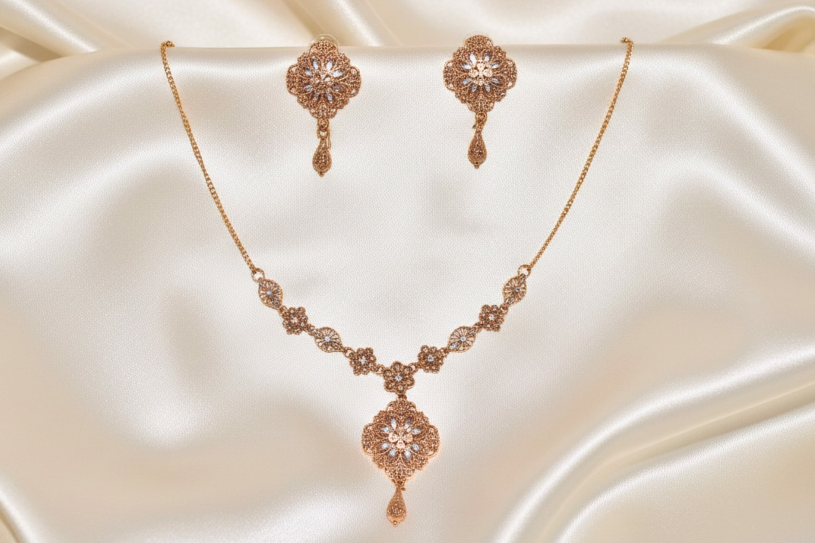 LC-0045 is a trending RP gold plated necklace set designed for women who love the royal beauty of gold jewelry with a soft modern touch. Its deep golden shine mixed with gentle silver highlights gives it a very rich and premium look, just like real gold jewelry. The necklace features fine floral net style carving where soft silver toned detailing is gently placed inside the floral shapes. This contrast makes the design look brighter and more eye catching. Small floral links lead beautifully to a large center floral pendant that finishes with a neat hanging drop, adding graceful movement and a royal touch to the neckline. The matching earrings follow the same floral design with silver highlight touches and a small hanging drop, completing the look in a very balanced and classy way.