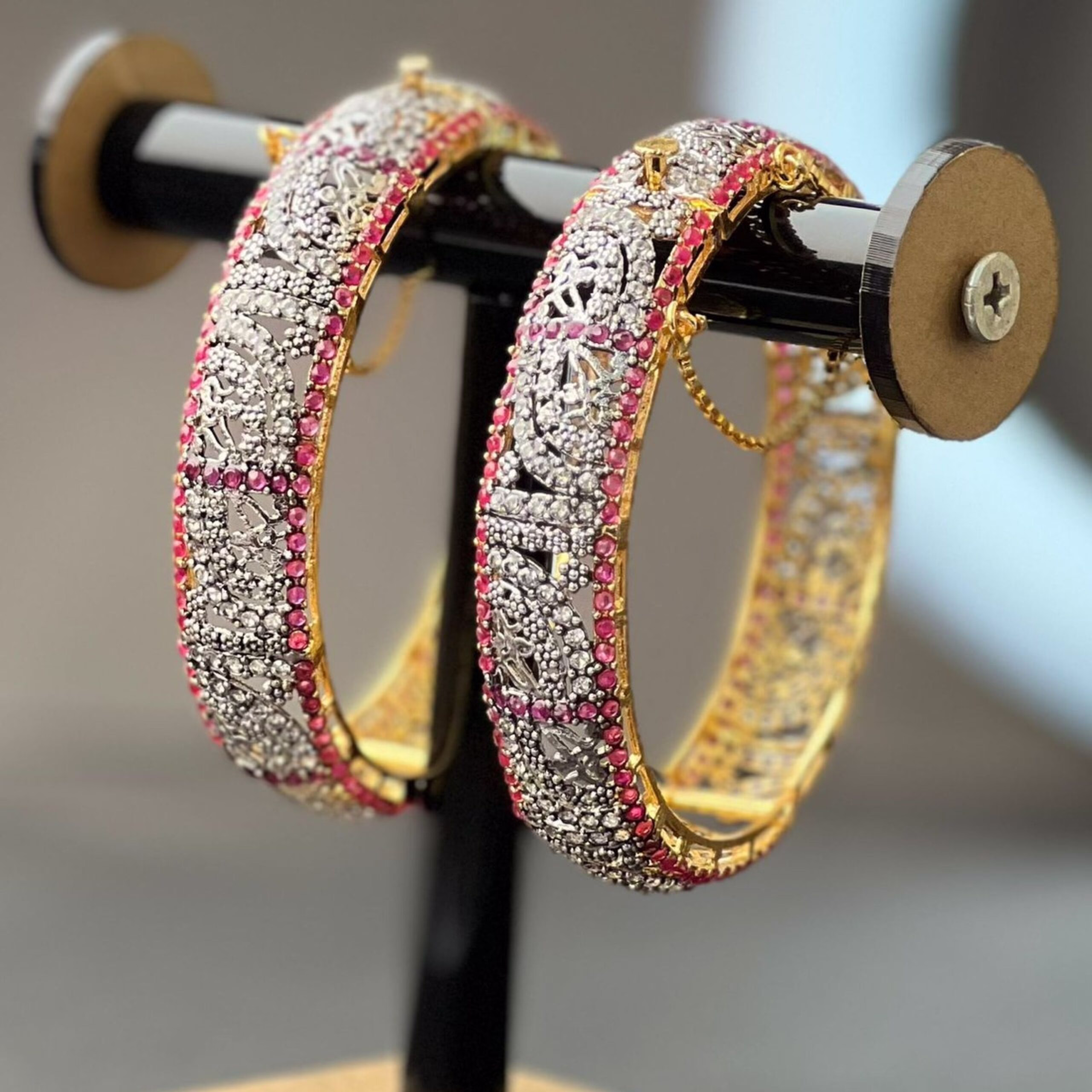 💎 Design: Openable Kara Pair with pink gemstones and white zircon stones.