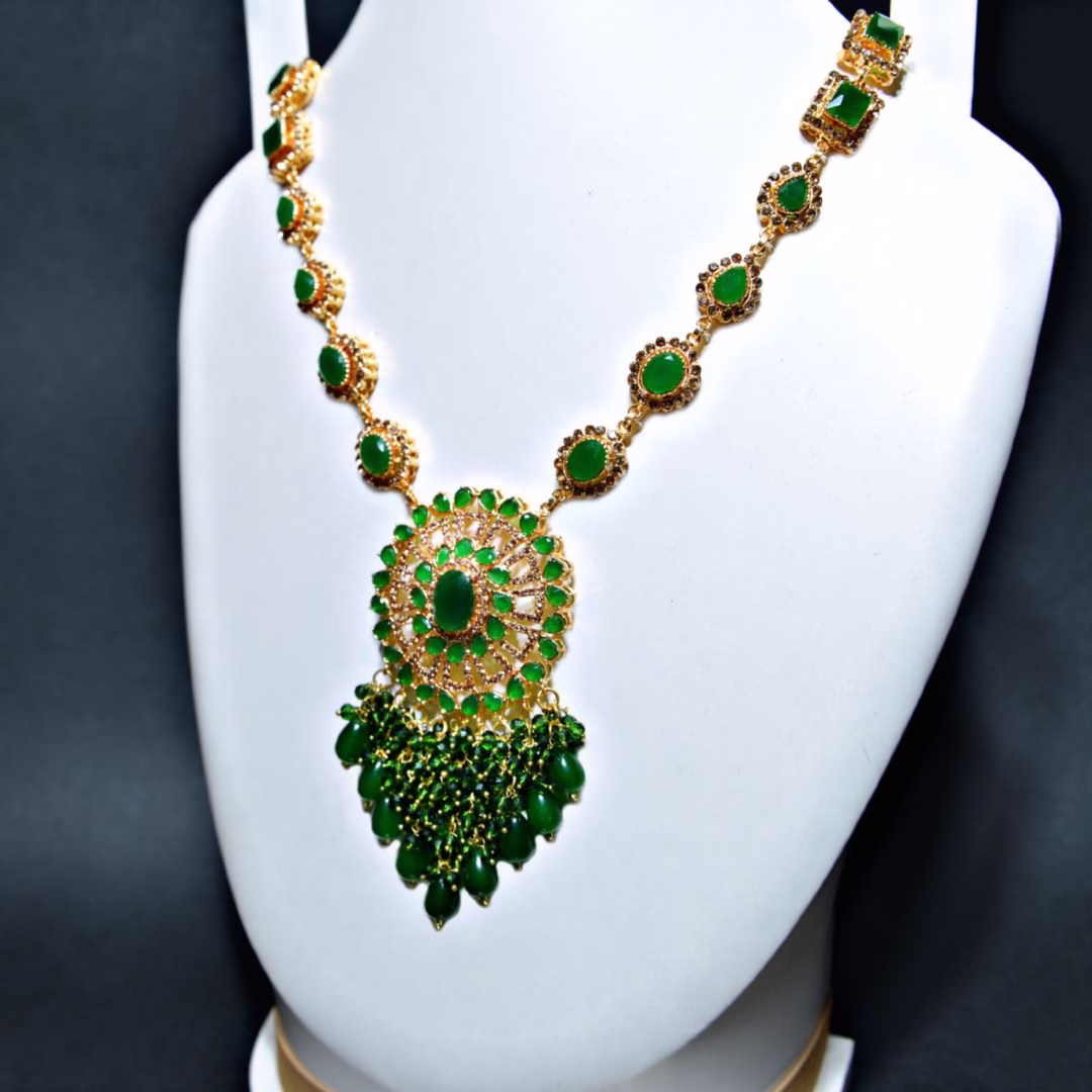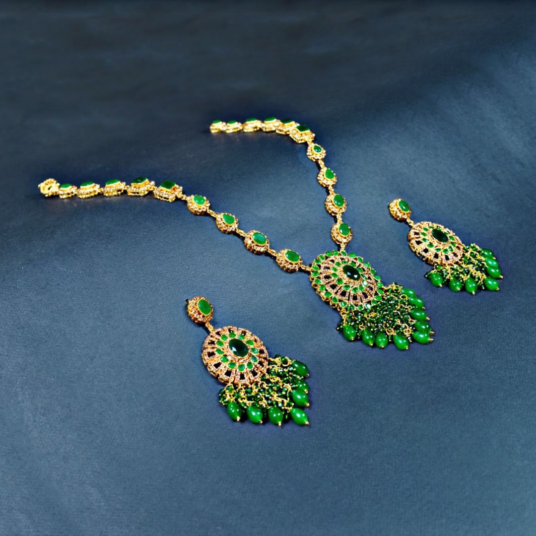 Eleganza MALS 005 is a trending green color heavy bridal mala set designed with a royal golden base and sparkling green zircon stones & tiny light brown crystals. It carries the trending green shade that brides love this season. The detailed circular design and fine craftsmanship bring a rich traditional charm with a modern royal touch. The light brown crystals add extra shine, while the green hanging beads give the perfect bridal sparkle. This set completes every bride’s dream look with elegance and beauty.