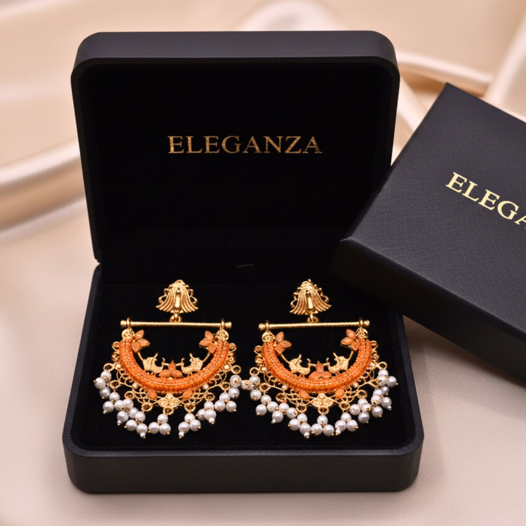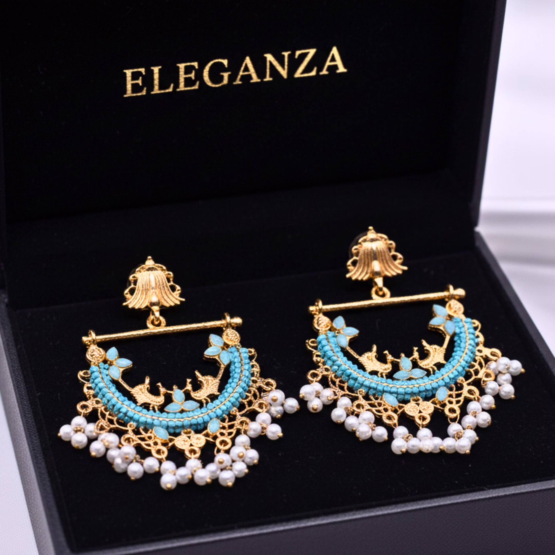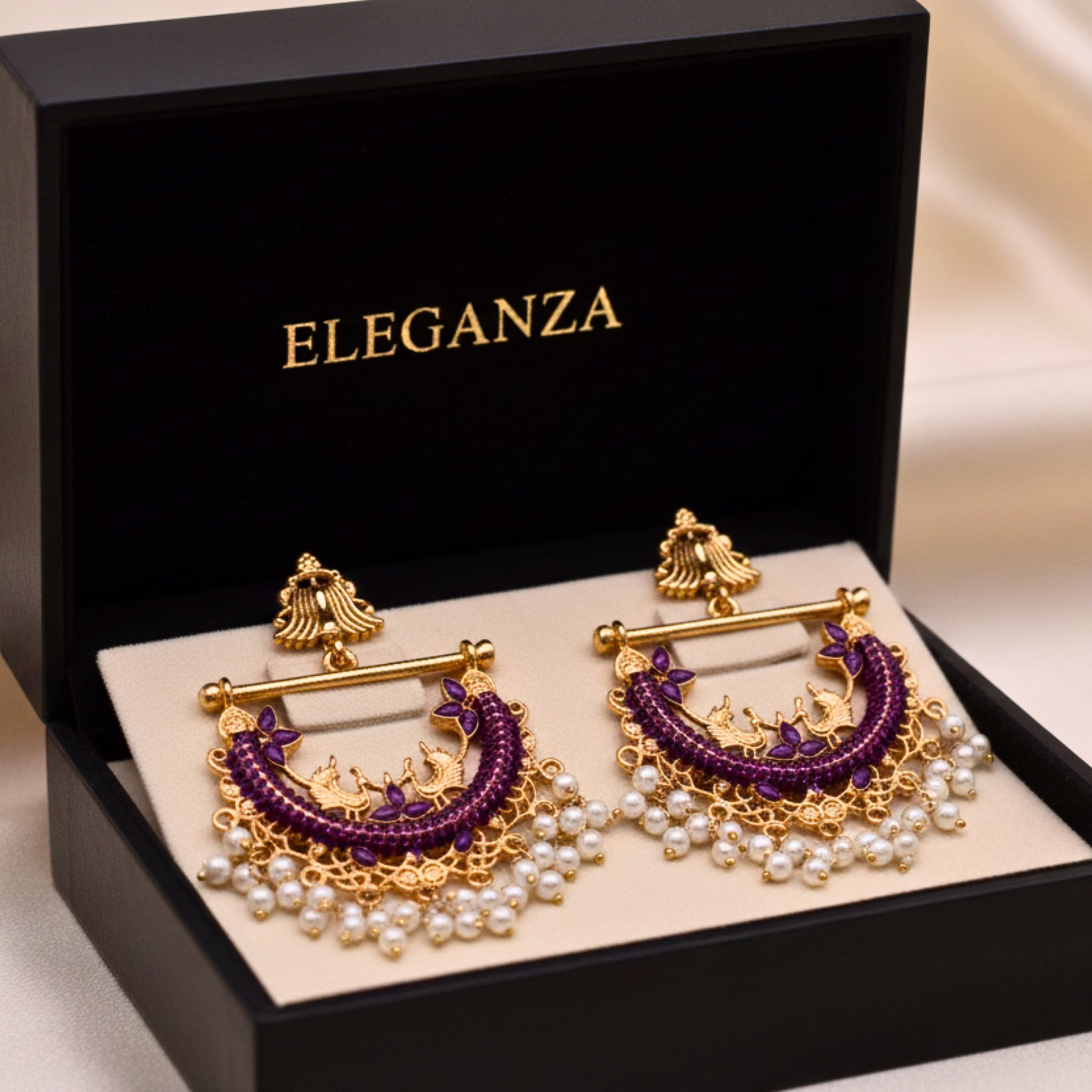 Eleganza ER 0053 is a stunning, latest trending earrings pair designed with a crescent shape, fine stone setting, and two peacocks placed beautifully at the center.