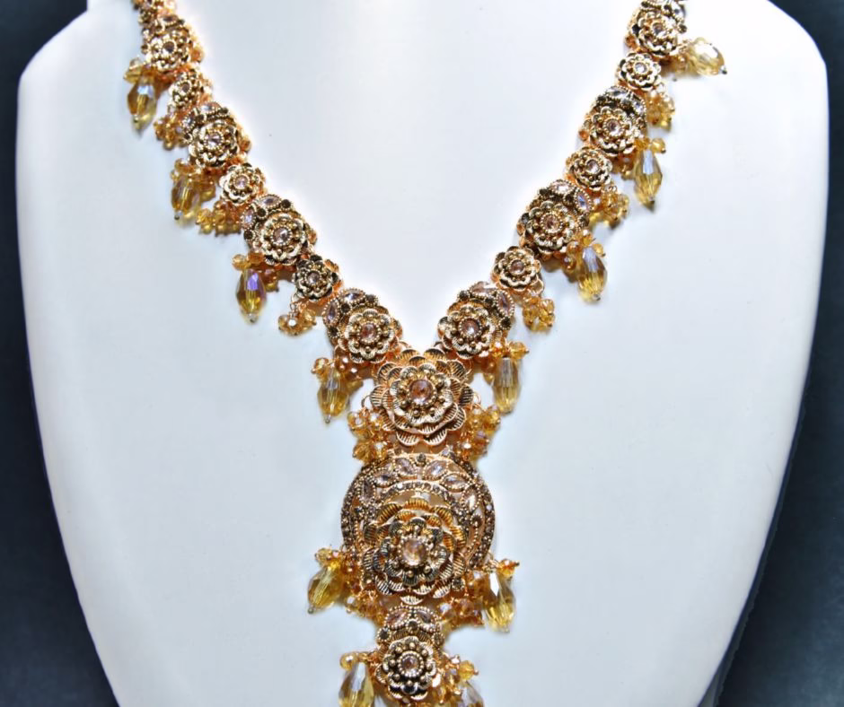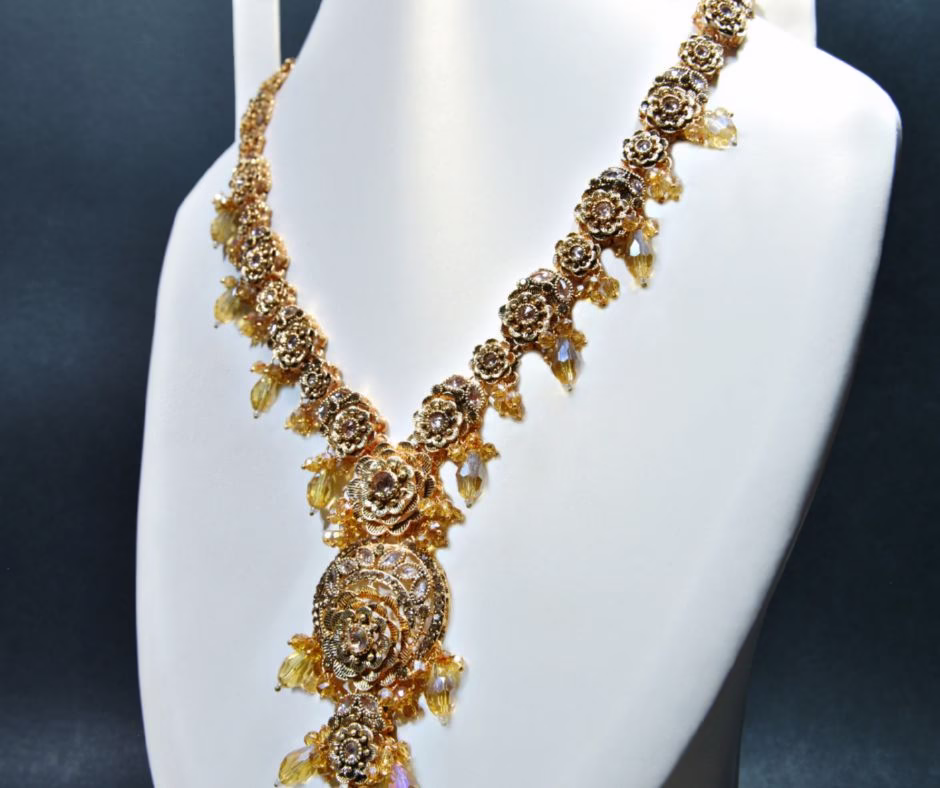 Eleganza MAL 008 is a stunning bridal heavy Mala designed with a golden floral base. Each flower is set with a champagne-colored stone, creating a soft and graceful shine. The centerpiece is highlighted with a sparkling zircon stone, carefully surrounded by tiny champagne crystals for an eye-catching finish. The Mala is completed with hanging champagne beads that add elegance, movement, and a rich traditional look.