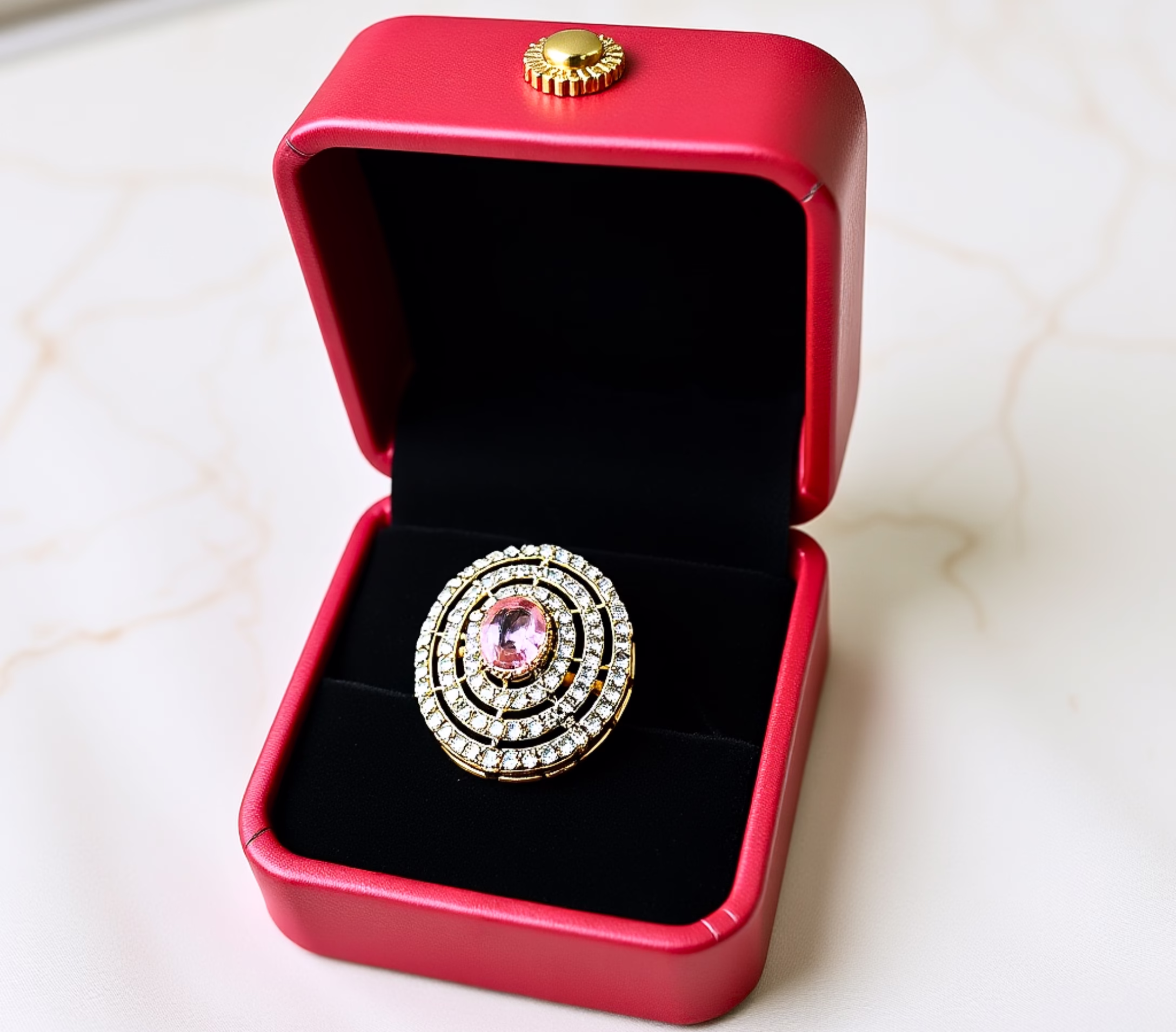 This stunning ring is crafted in a luxurious bridal style with a bold and eye catching design. It features an oval shaped zircon stone at the center, available in beautiful colors like green, champagne, pink, and red. The center stone is surrounded by multiple layers of small white crystals arranged in a circular pattern, giving the ring a rich sparkle and royal look. The golden base enhances the shine and adds a warm, elegant touch, making the ring look premium and expensive. The crystals reflect light beautifully, making your hands look graceful and stylish at every angle. Its big and fancy design makes it perfect for weddings, parties, and special occasions. The adjustable band ensures a comfortable fit, so women and girls of all ages can wear it easily and confidently.