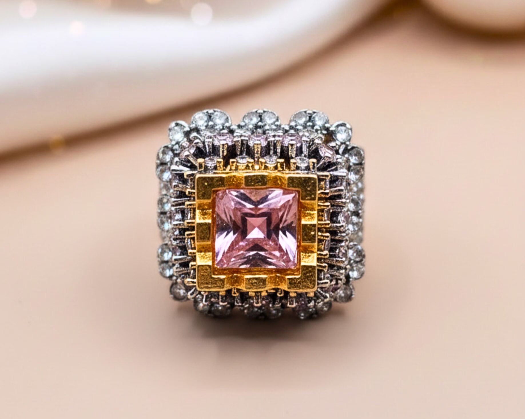 This is a heavy Turkish style party wear ring with a bold, royal, and eye-catching look. It features a big center zircon stone, available in Red or Pink color options, surrounded by tiny sparkling zircon stones that give a rich and fancy finish. The TNT golden base gives strong shine and long lasting color that stays beautiful for a long time with proper care. Its heavy feel shows high quality, and the adjustable size makes it comfortable and easy to wear.
