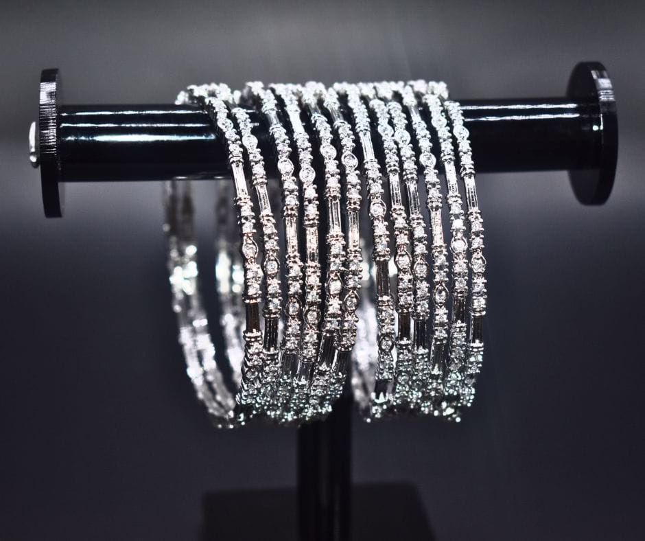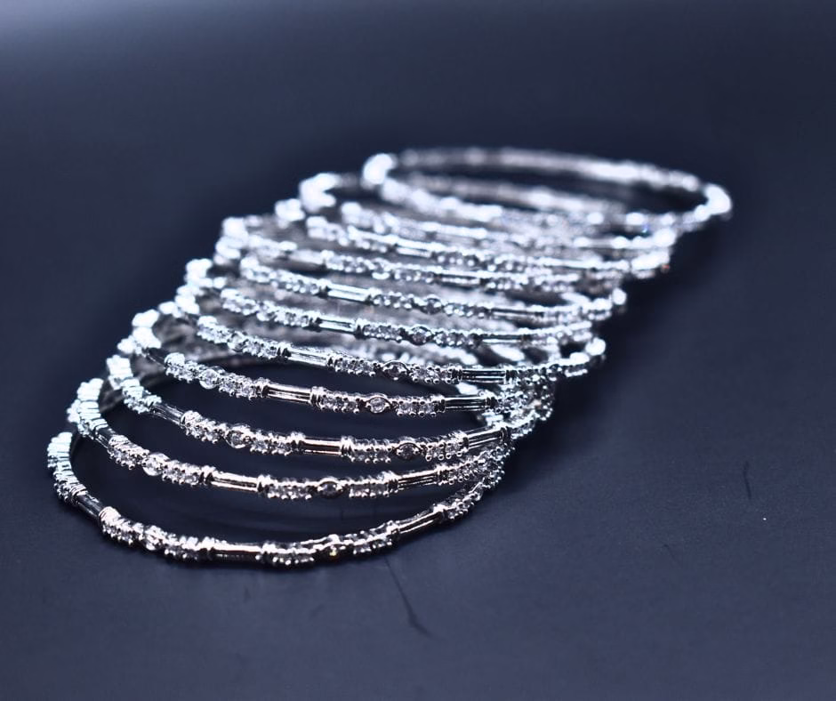 The Eleganza BG 0013 1k bangles set is designed to impress. Each bangle is delicately crafted from 1k material and adorned with white shiny zircons, reflecting light beautifully and creating a stunning shimmer.The bangles come in a beautiful silver color,adding a touch of elegance to any outfit. The design blends traditional charm with a modern touch, making these bangles versatile enough to wear with both ethnic and contemporary outfits. Whether you’re dressing up for a wedding, Eid celebration, or a casual outing, these bangles will elevate your look.