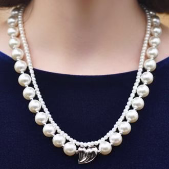 This beautiful pearl necklace is designed in a modern double layer style that gives a clean, classy and trendy look. The outer layer is decorated with big round heavy grade pearls that create a rich and graceful feel, while the inner layer features tiny fine pearls that sit gently closer to the neck for a neat layered finish. At the center, a stylish silver heart style shaped Charm adds a modern and eye catching touch, making the necklace look unique and fashionable. Its soft shine and stylish layered design make it perfect for students and young girls who want a simple yet modern necklace that looks beautiful with every dress, frock, kurti and casual outfit.