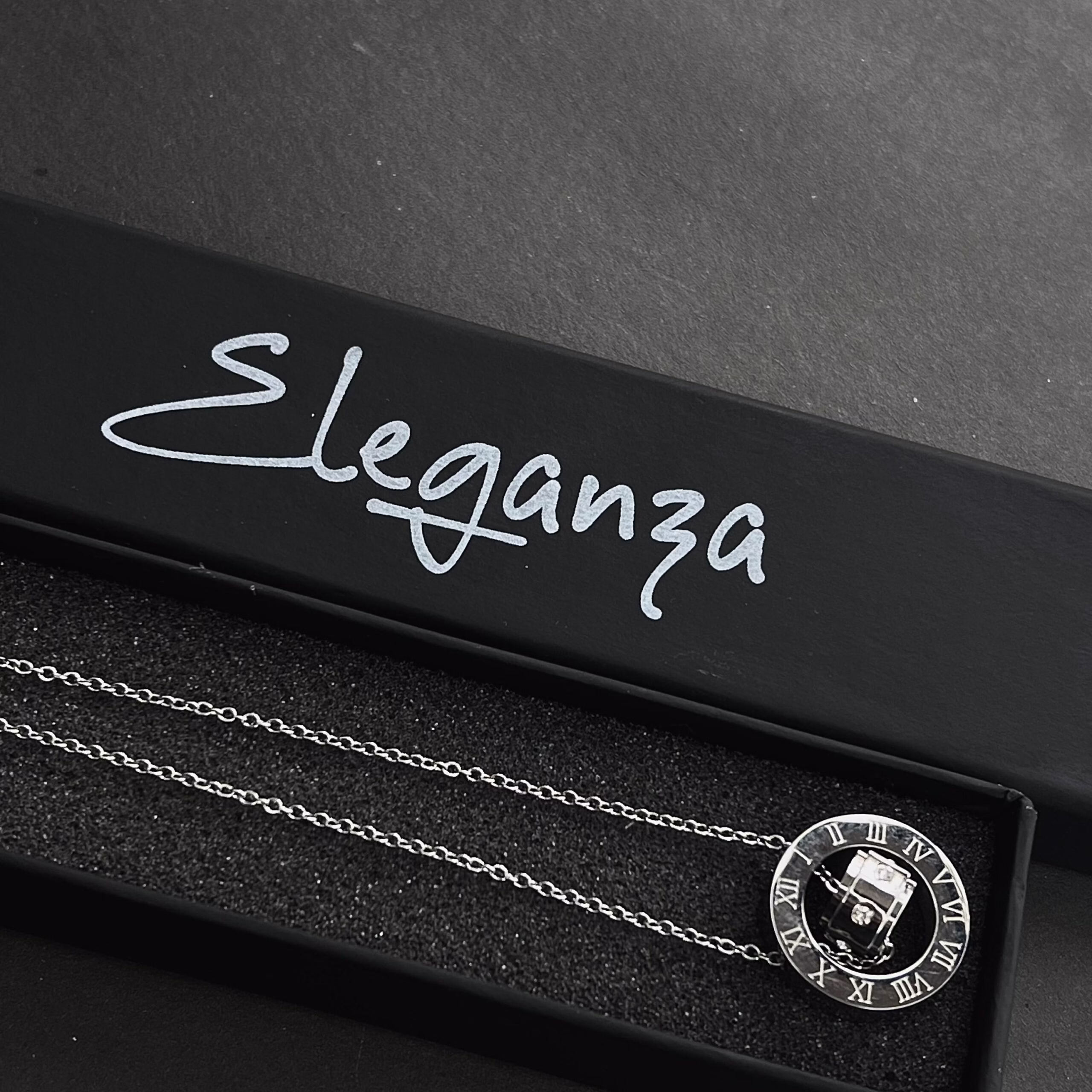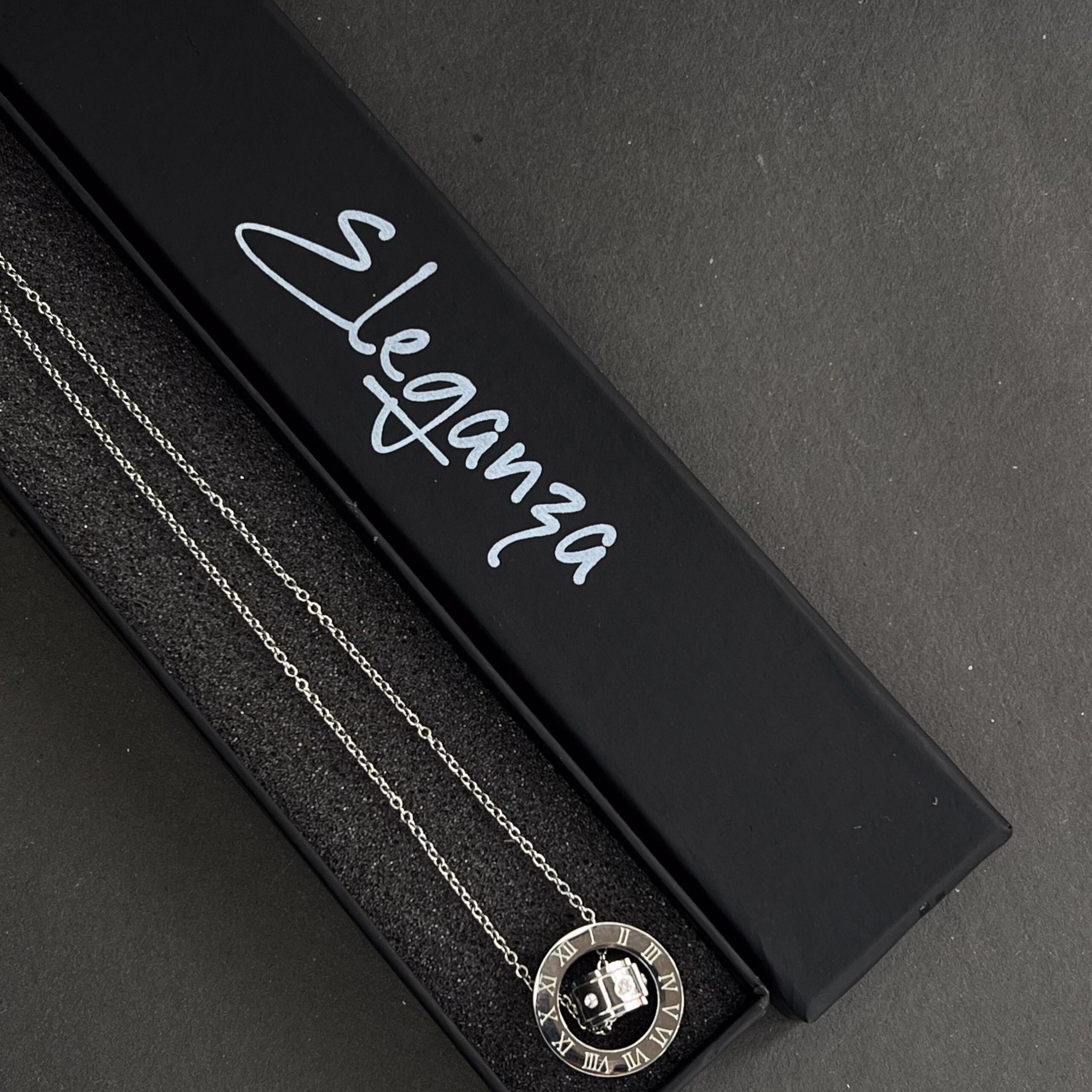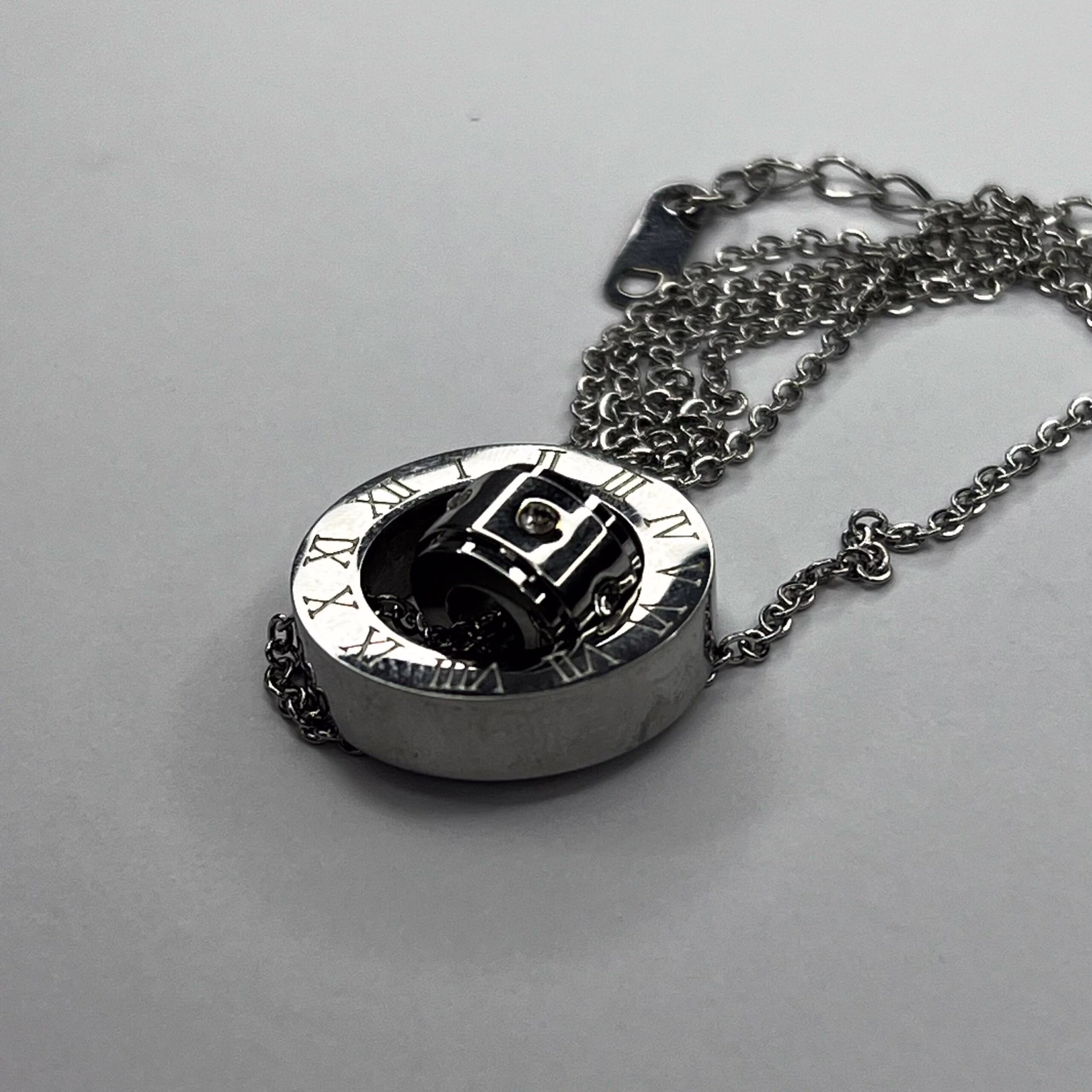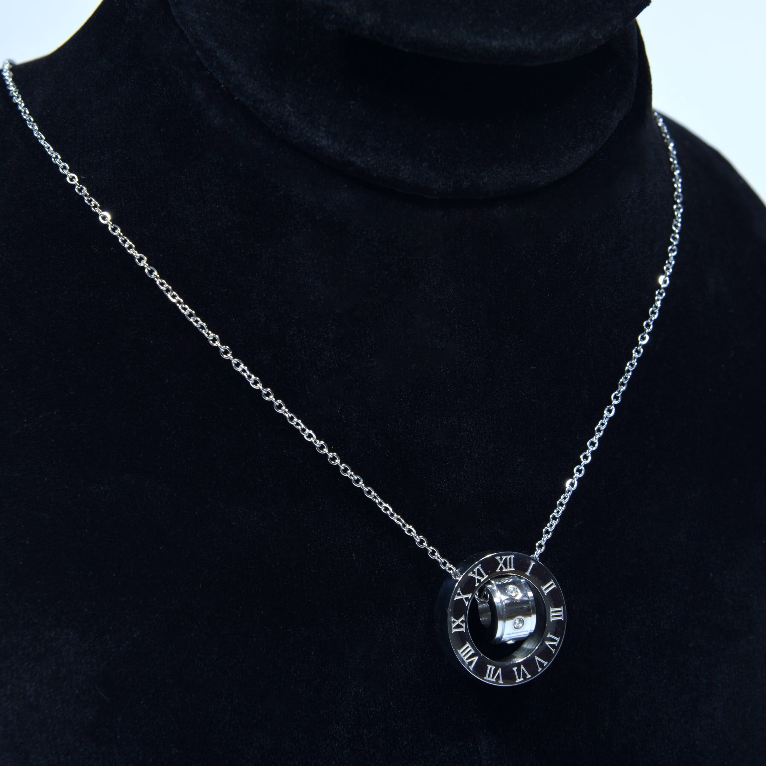 This necklace is made from high-quality stainless steel, ensuring long-lasting shine and durability. Unlike other metals that fade or tarnish over time, this silver-toned piece maintains its beauty with minimal care. The smooth polished finish gives it a luxurious feel, while the engraved Roman numerals symbolize enduring elegance and sophistication. The crystal centerpiece adds a radiant glow, making this necklace a standout piece for any occasion.
