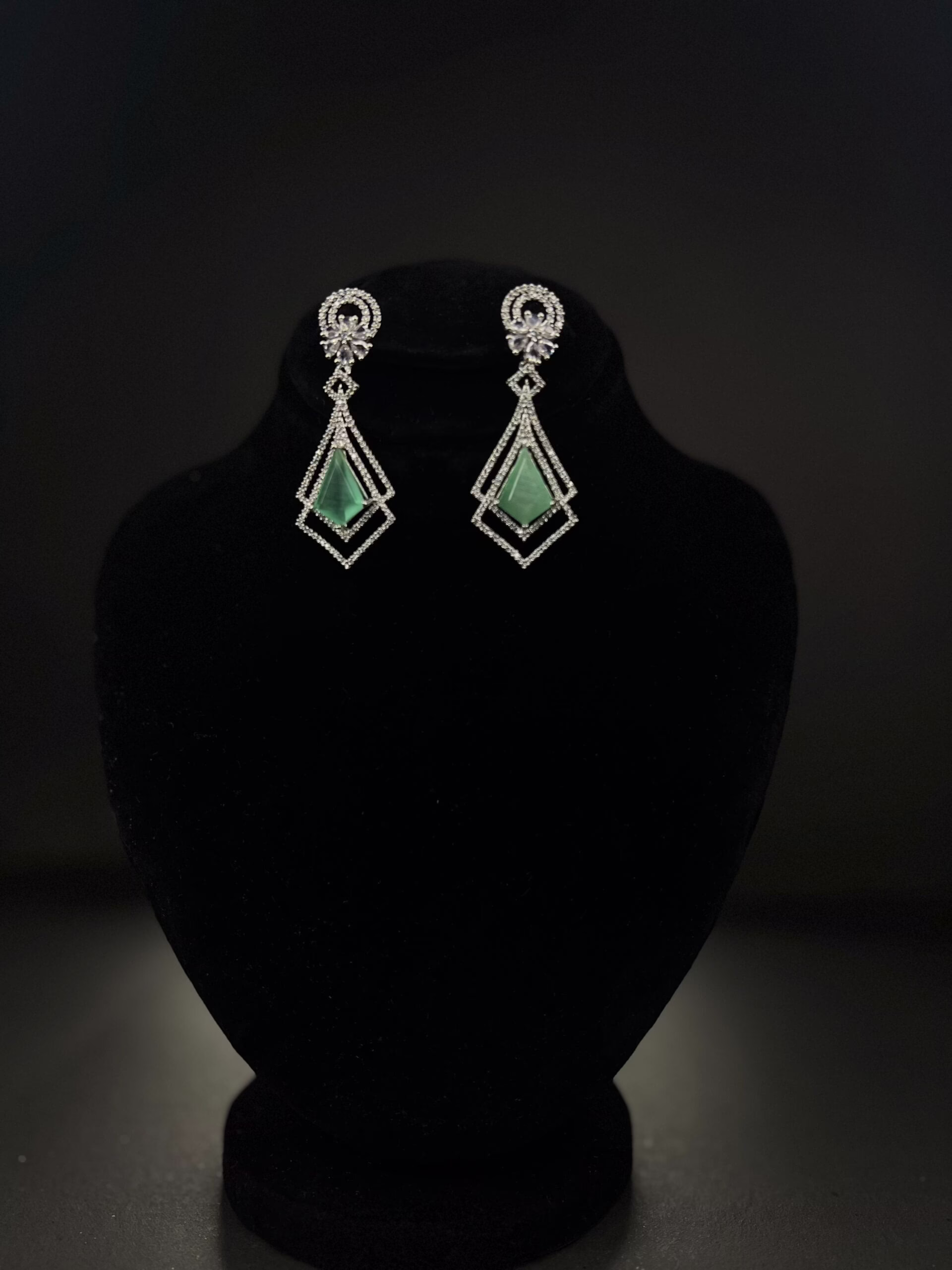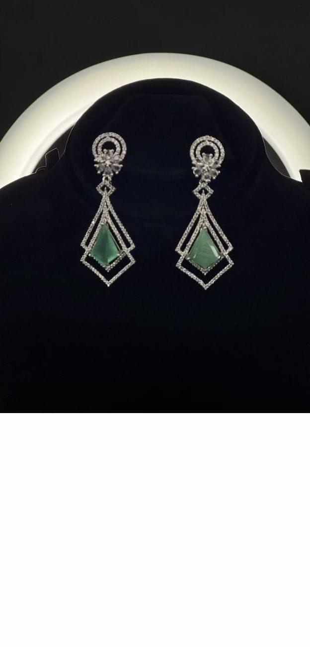 The Eleganza ER0011 earrings combine elegance and charm, perfect for weddings and parties. The design starts with a round top surrounded by sparkling crystal stones. Below that is a delicate floral pattern that adds a feminine touch. The main feature is two diamond-shaped frames—the outer frame is decorated with shiny stones, and the inner frame holds a sea green triangular stone. Made with a silver base and crystal accents, these earrings are both stylish and graceful, making them a great choice for special occasions.