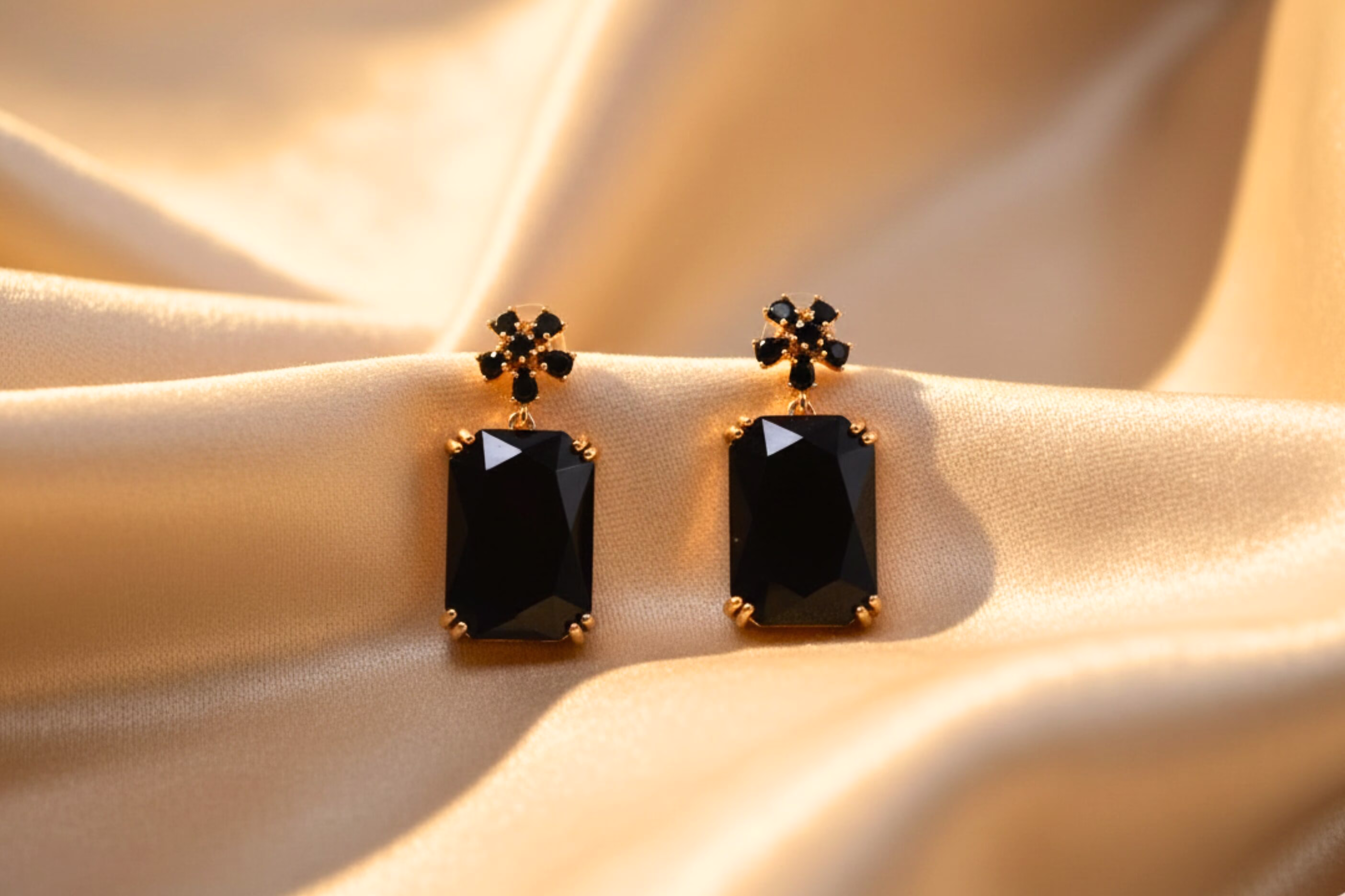 These earrings feature a stunning floral zircon top connected to a bold rectangular black zircon stone, creating a classy and elegant look. The golden detailing enhances the zircon shine, giving a fashionable finish. Perfect for both modern and traditional outfits, these earrings are lightweight, stylish, and trending ideal to elevate your everyday and event looks.