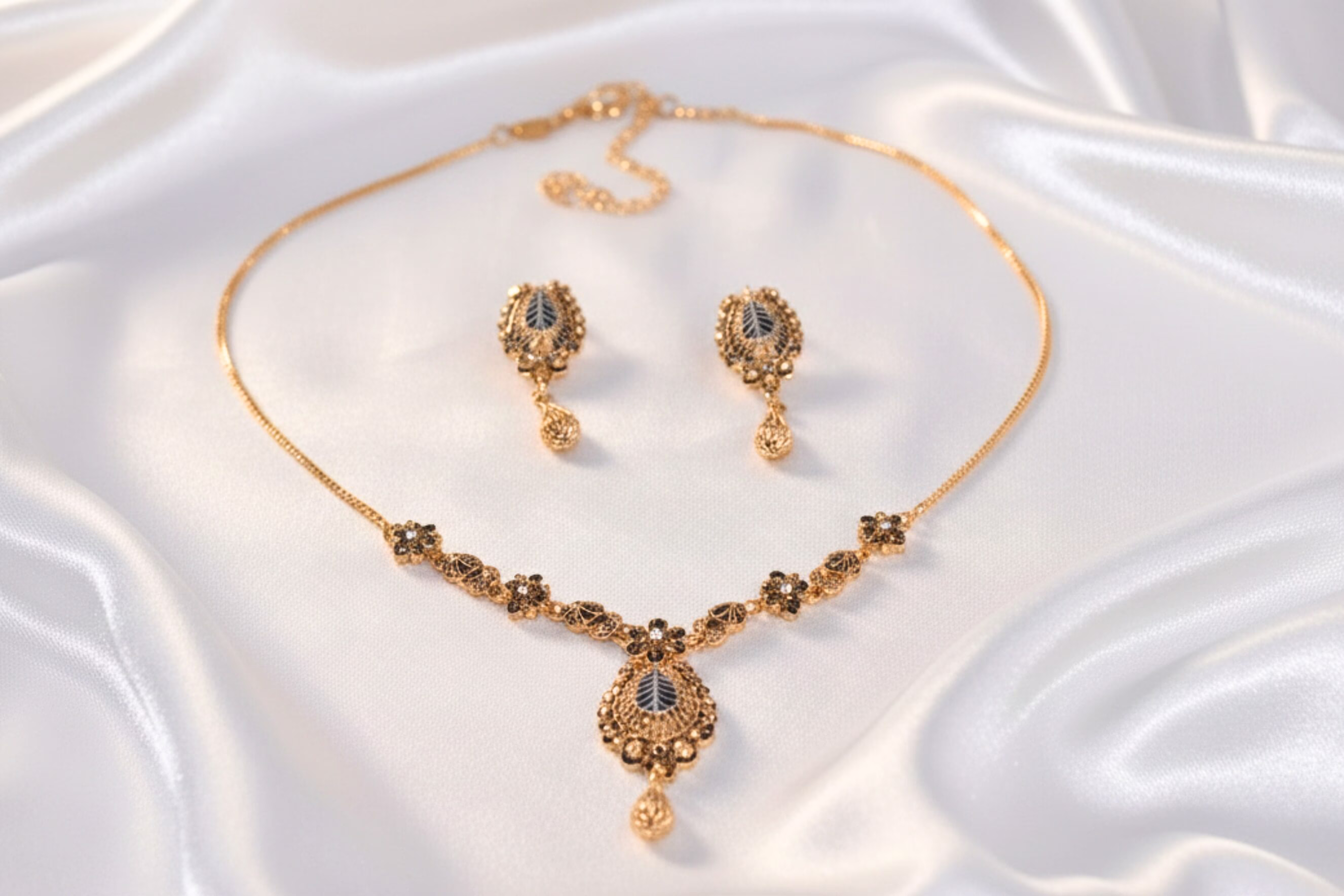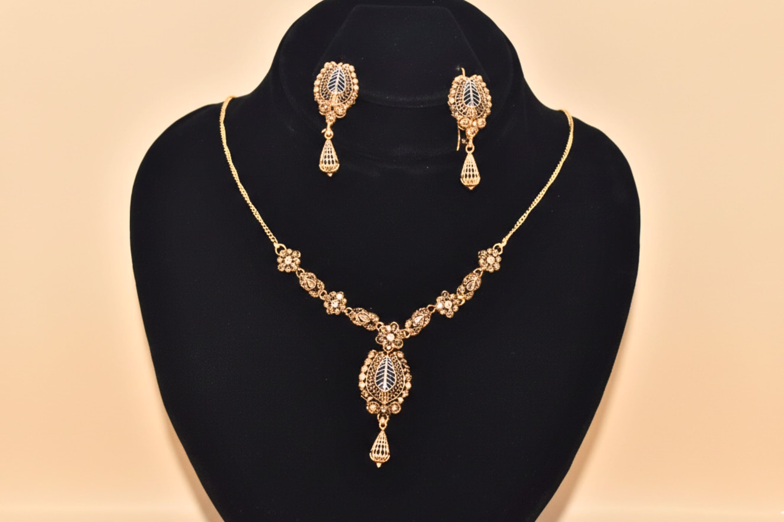The matching earrings follow the same net style pattern and carved detailing, making the full set look balanced, rich and premium when worn together. Its RP polish gives a neat shine and long lasting color that stays beautiful for a long time. Light to wear, comfortable and elegant, this set is perfect for party wear, festive functions, weddings and stylish gifting for someone special.